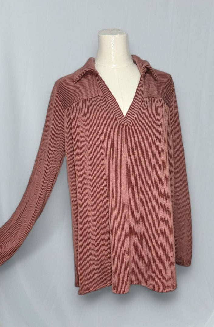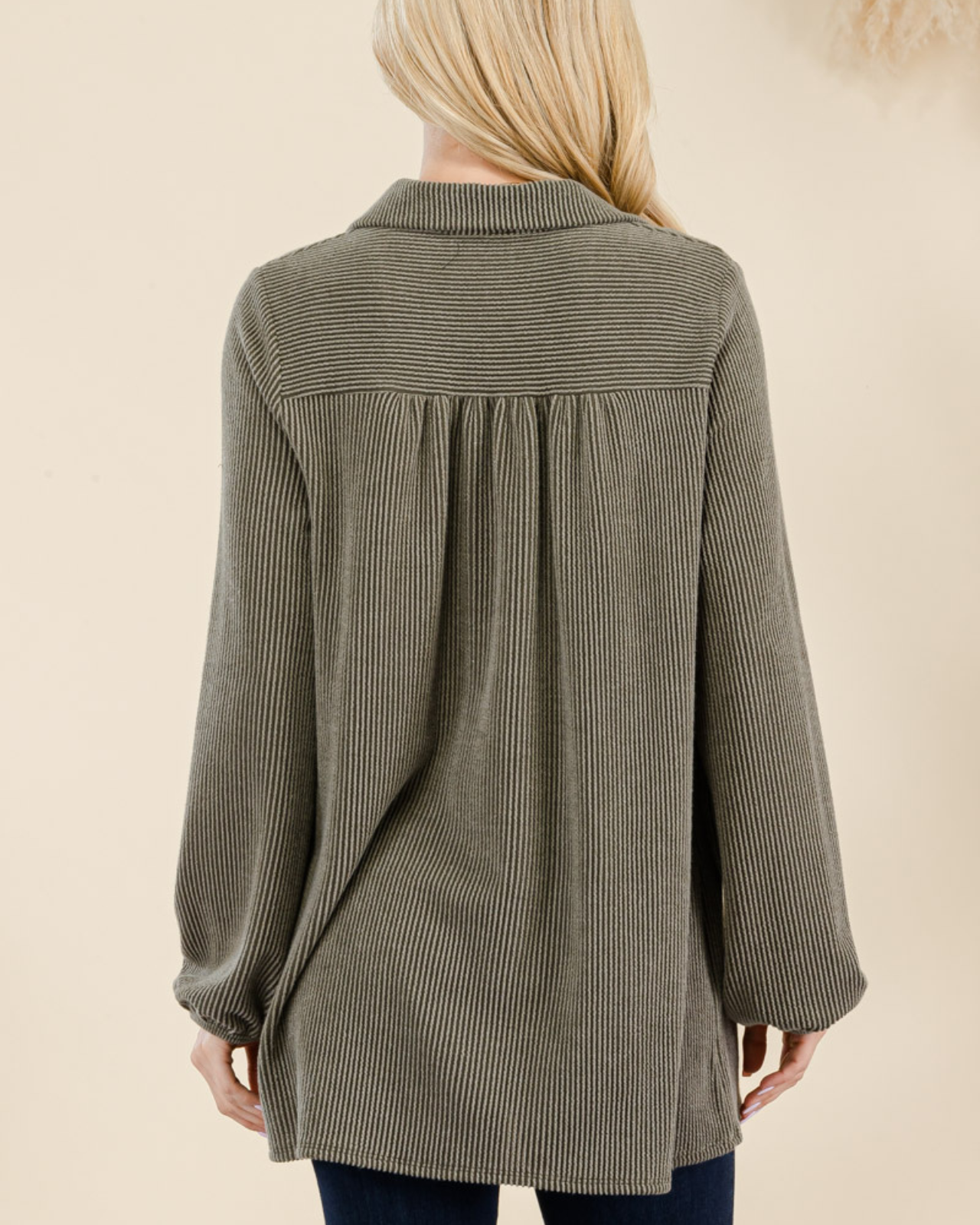 Crafted with a graceful V-neck collar and delicately elasticized cuffs on its long sleeves